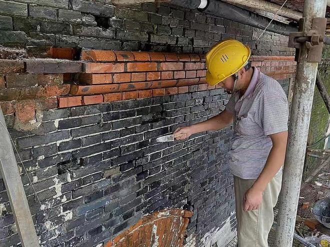 在清水墙修缮上,工人师傅手持扁钢凿轻敲慢凿,剔除 20—30mm 深的旧灰缝,再用规格、色泽一致的老砖抽砌补砌,连外立面特色造型线条都定制同纹砖块复原,最后用传统平色工艺调和颜料、石灰,让墙面肌理与百年前别无二致;