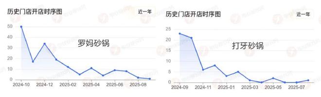与此同时,各大品牌的拓店速度也肉眼可见地放缓。窄门餐眼数据显示,自2024年12月起,罗妈砂锅每月新增门店数量明显骤减,打牙砂锅的月均新开店数更是低至个位数,与巅峰时期的扩张力度相去甚远。