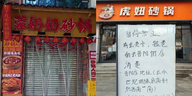 这样的场景在江苏、山西等地陆续上演:山西太原德锦城一家“虎妞砂锅”,因性价比圈粉了不少食客,结果突然关店,顾客只能前往晋阳街店核销;江苏宜兴“周火火砂锅”同样闭店突然,有人卡里的余额尚未消费完;重庆观音桥有一家网红店“蓉奶奶砂锅”,过去因“人均二三十,道道都下饭”在开业后大排长龙,但仅开店几个月就走向闭店,只剩门头上“做了几十年砂锅菜”的条幅随风飘扬……